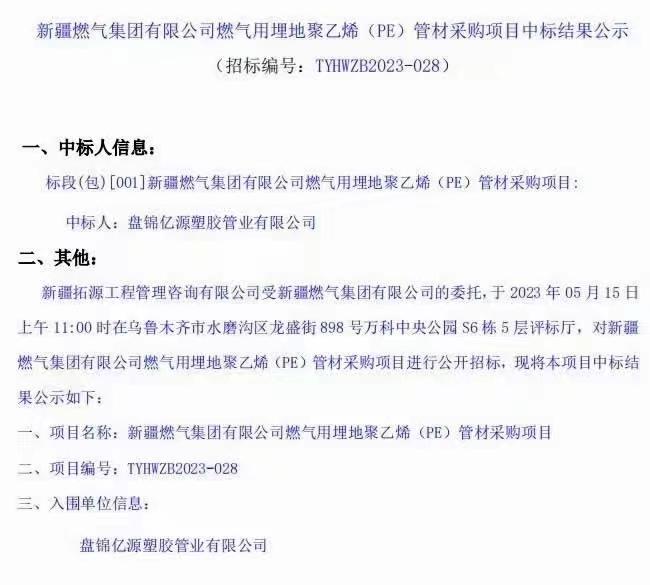 【熱烈慶祝億源管業(yè)成功中標(biāo)《新疆燃?xì)饧瘓F(tuán)有限公司燃?xì)庥寐竦鼐垡蚁≒E)管材采購項(xiàng)目》】